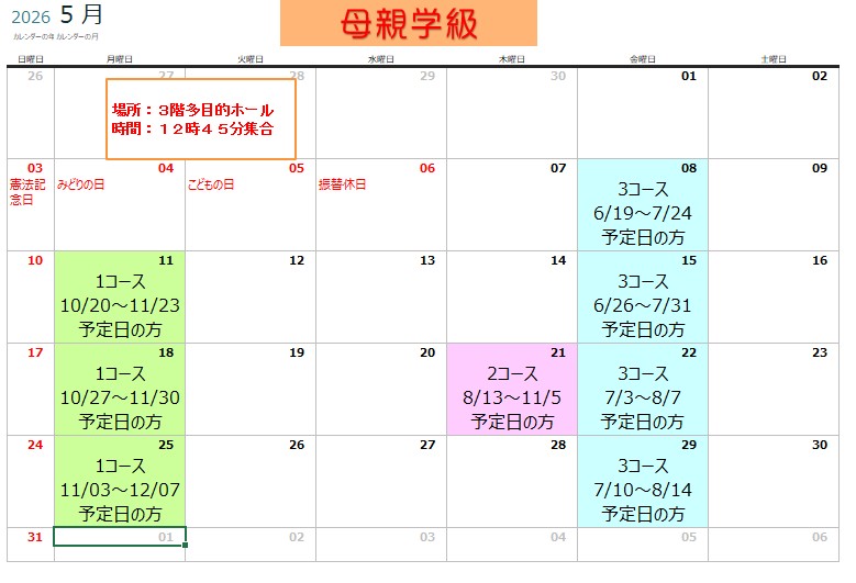 母親学級カレンダー5月分